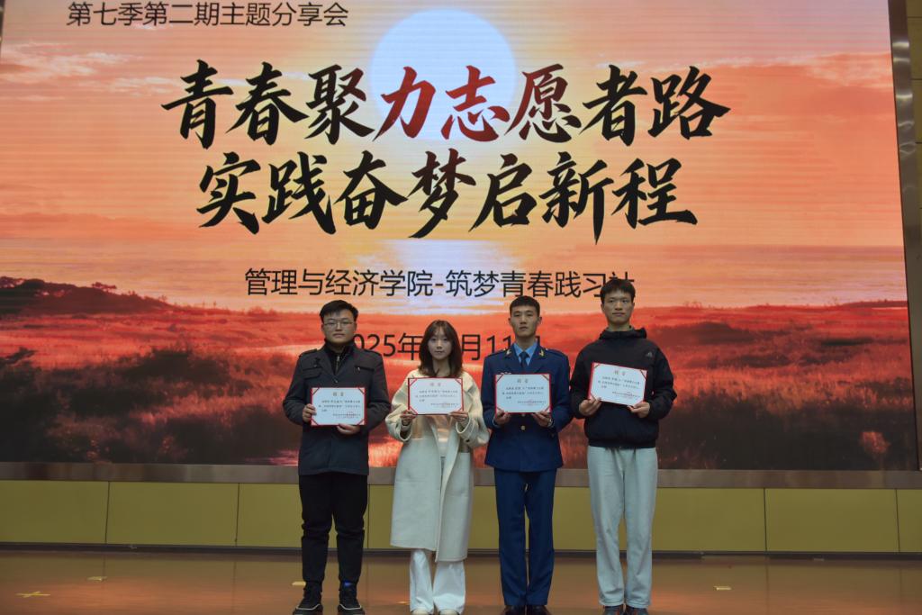 2025年12月11日下午,管理与经济学院筑梦青春践习社在管经院D102报告厅策划与组织了“青春聚力志愿路,实践筑梦启新程”主题分享会。此次分享会是2025年“青马工程”青卓班培训课程,全院师生共计150余人参与。